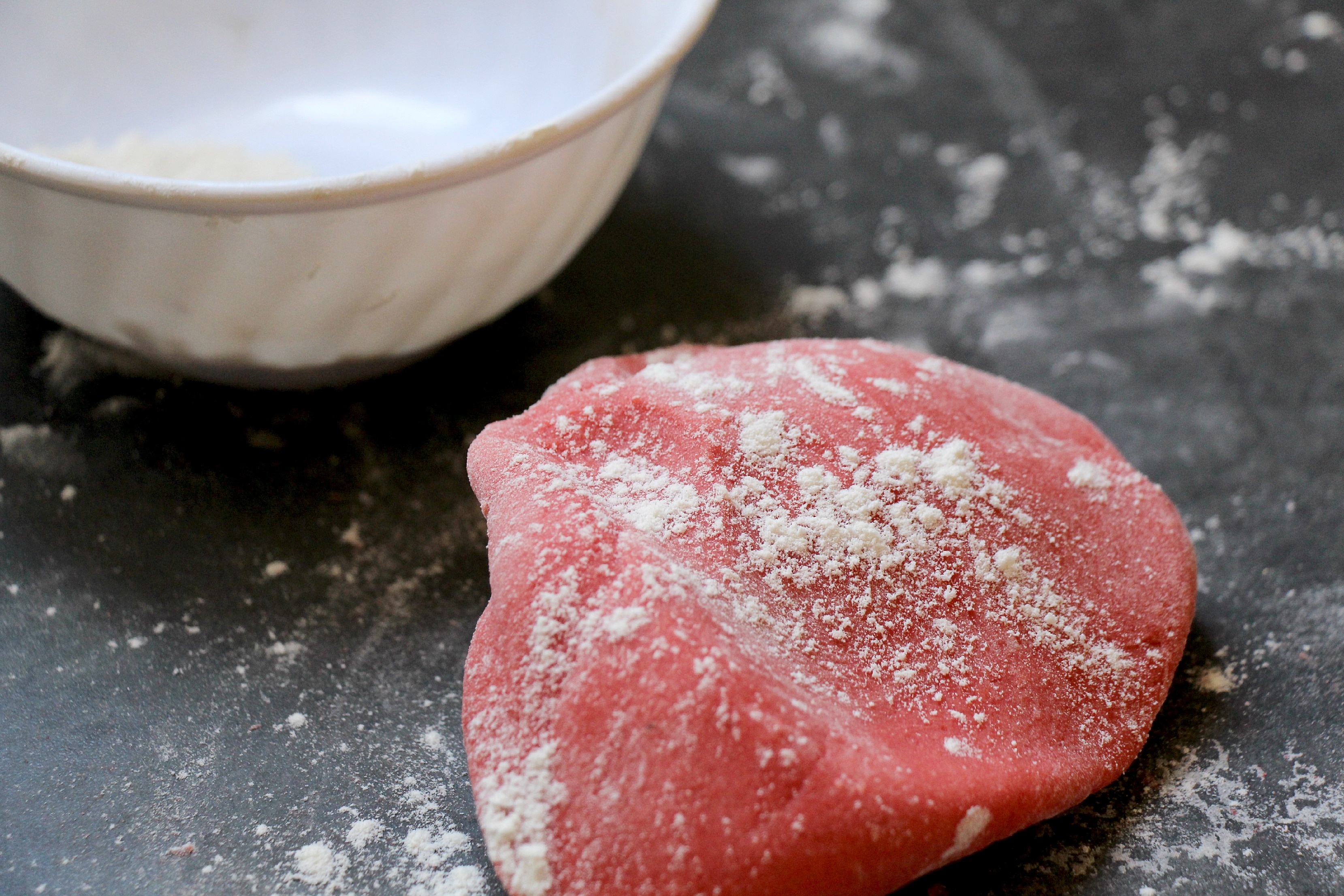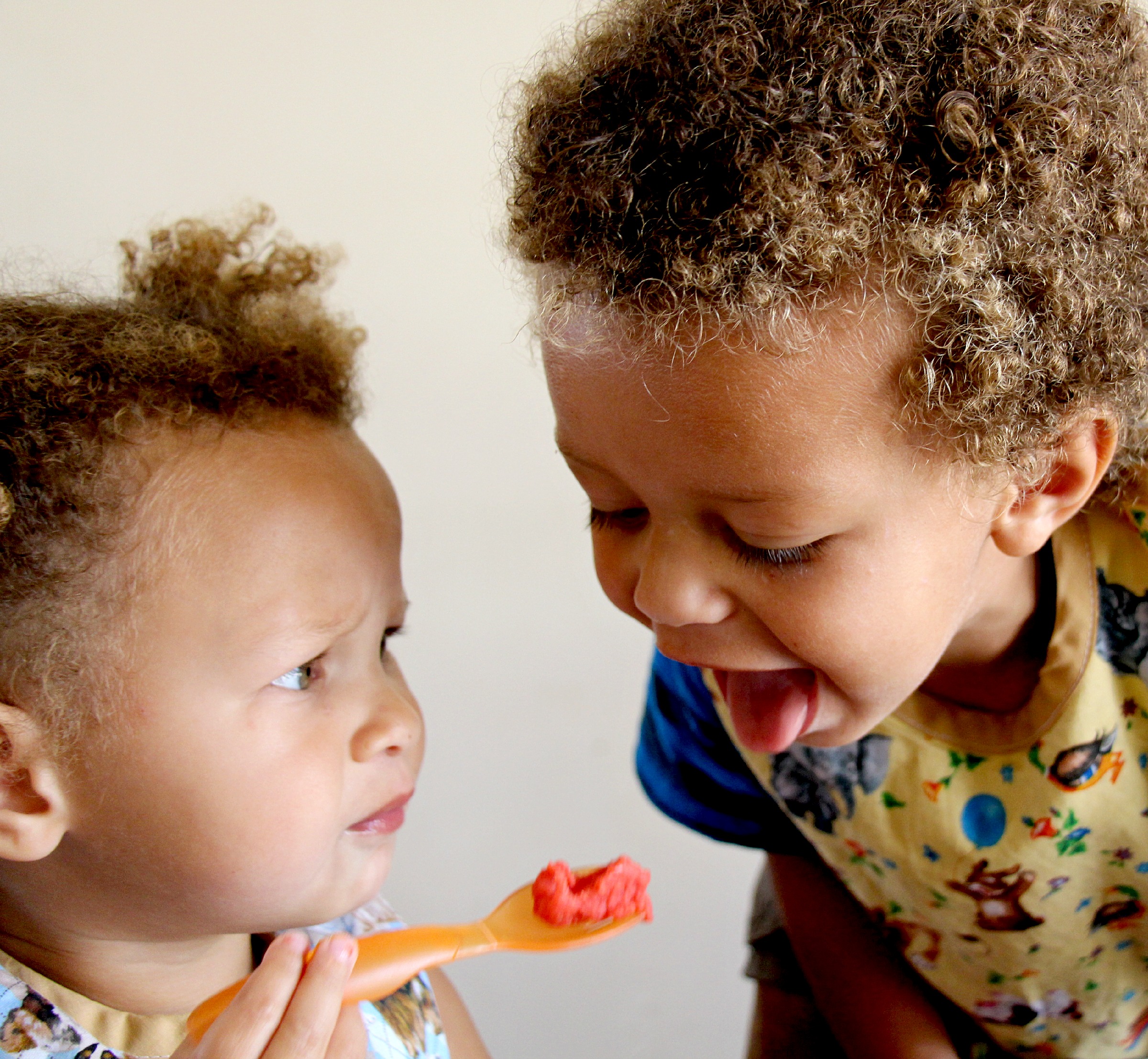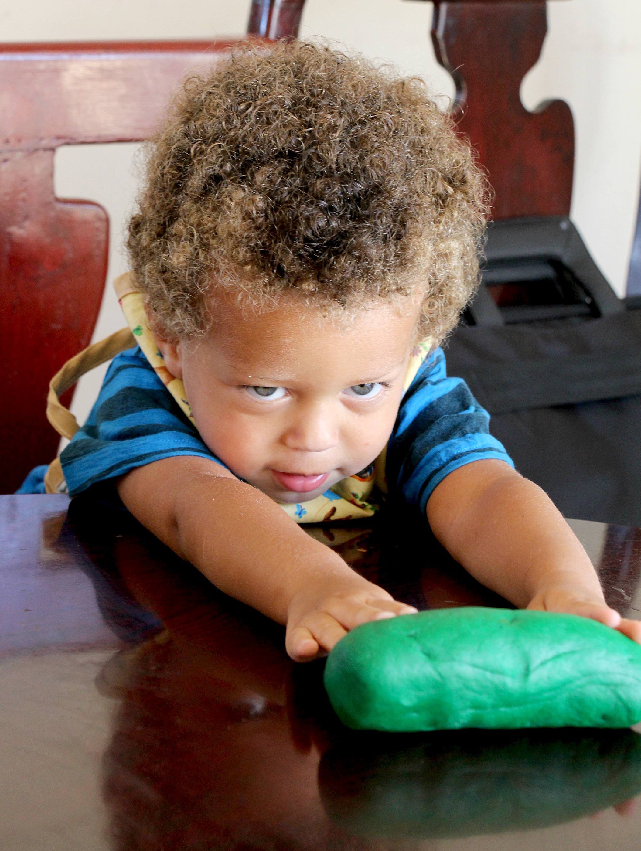 Red DoughI was having so much fun making the play dough I caught myself wishing that Max and Elly would wake up early from their nap so we could start playing. I quickly talked myself out of that nonsense and kept working. Just as I was ready to knead the fourth batch, Max and Elly showed up in the kitchen; they had, in fact, woken up early from their nap.