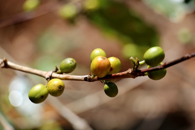 The fruit of a coffee trees are called cherries. There are two coffee beans inside each cherry. Ripe coffee cherries are red; unripe cherries, like below, are green. The cherries ripen at different rates so we have the coffee harvested multiple times each year. Because there are both ripe and unripe cherries on the coffee tree at the same time, the harvesting process cannot be mechanized. It must be done by hand so the coffee picker can choose only the cherries that are ready for harvest.