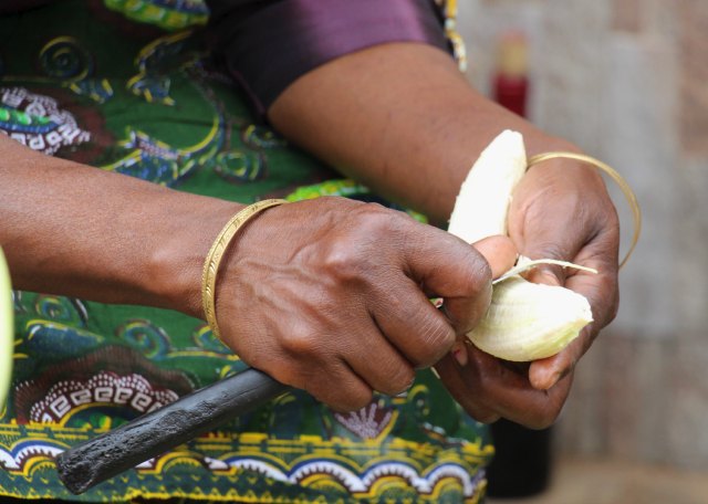They were peeling them in preparation for the soup, and also to roast some over the charcoal with the goat. They used a knife to cut a slice down the length of the banana, cracked it open to remove the peeling and then shaved away any of the stringy stuff you find inside bananas (the technical name for that stuff is phloem).