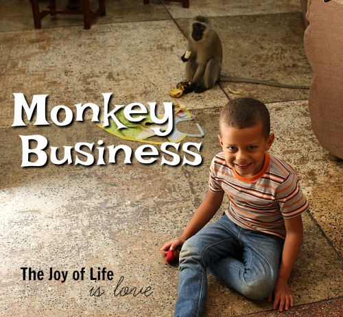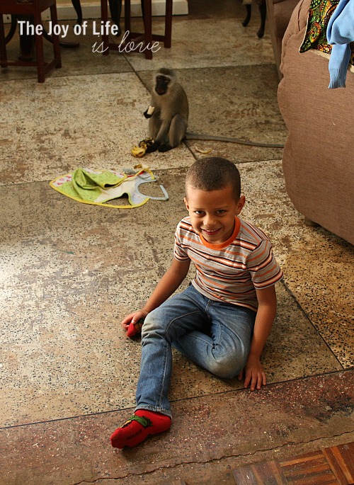 After his heist on Friday, the kids went down to the market and bought me a new bunch of bananas. And, wouldn’t you know it, the monkey came back for those, too! And this time he just made himself at home in our living room to eat them.