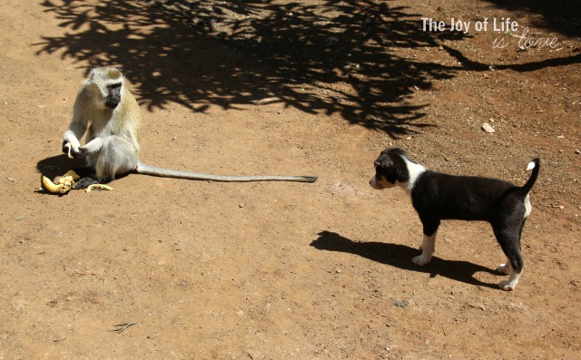 We chased him out of the house, but our new puppy was not the slightest bit intimidating to the monkey.