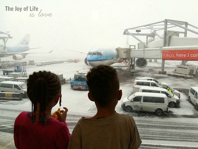 The snow in Amsterdam delayed our departure which made us miss our connection in New York. So we were rebooked on a flight the next morning which meant we had to sleep in the airport because it was too cold for us to go outside to get to a hotel (remember, we had no warm coats at this time because Mom was in Baltimore with them).
